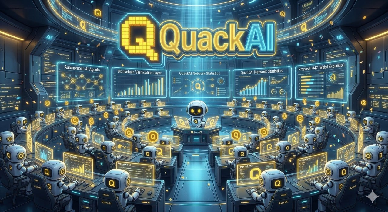 Это изображение иллюстрирует будущее цифрового управления, основанного на QuackAI в эпоху Web4. Десятки агентов ИИ работают вместе в футуристической управляющей палате, анализируя данные, проверяя слои блокчейна и автоматически голосуя за предложения.