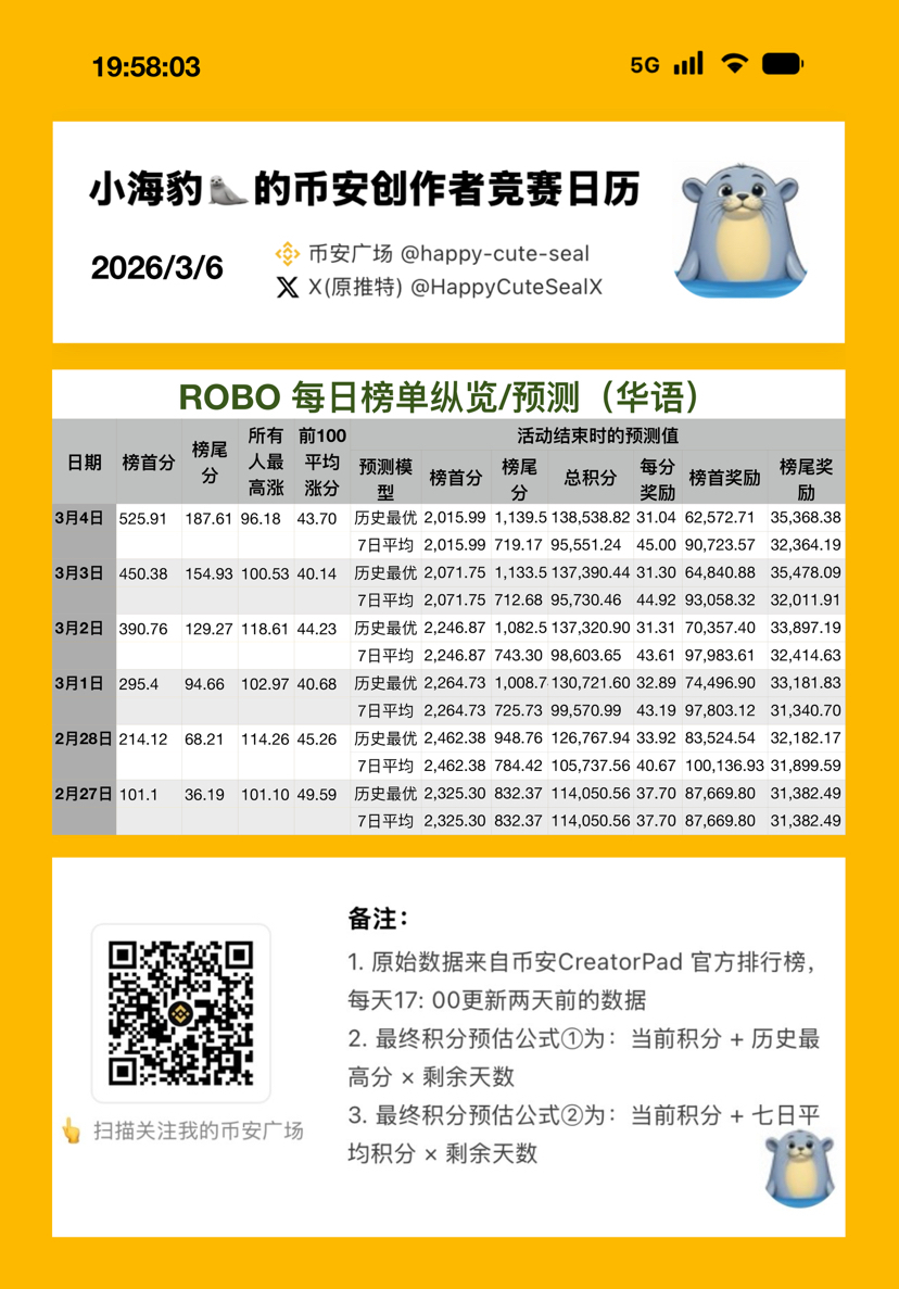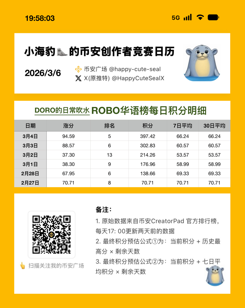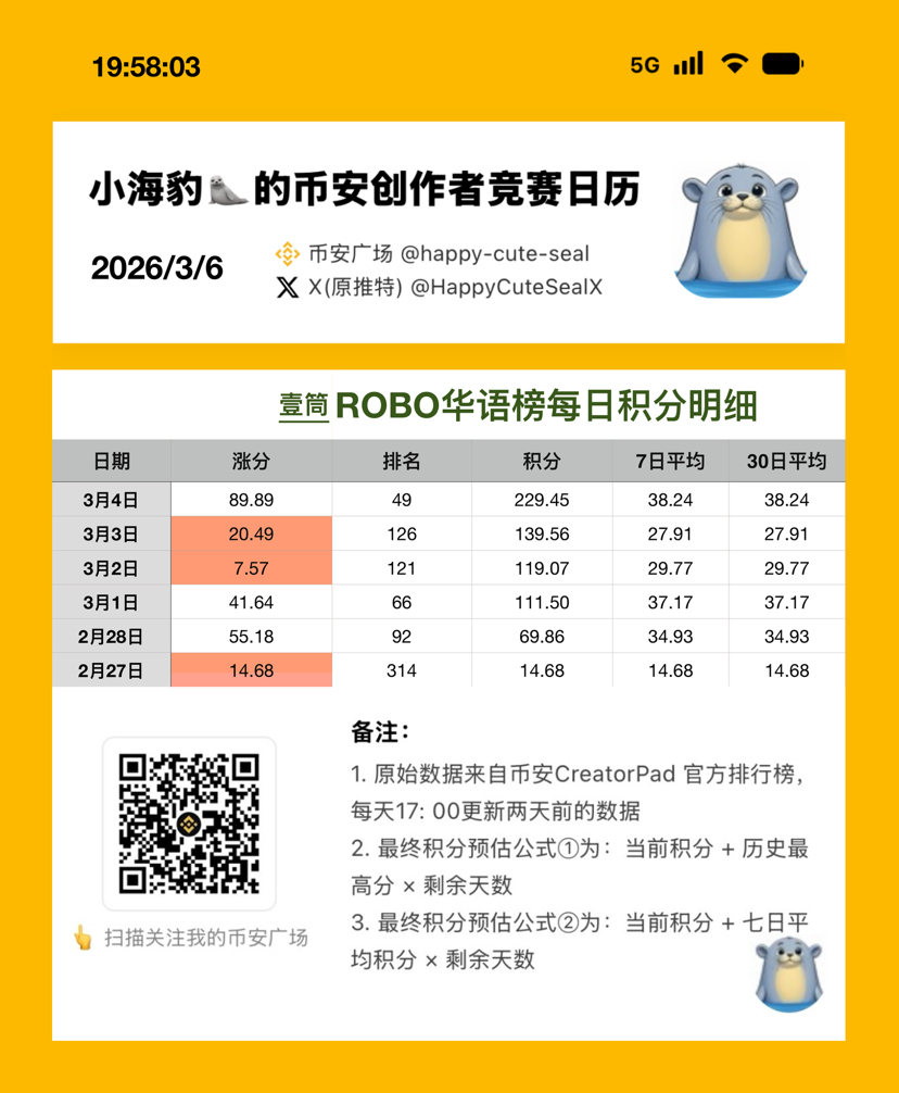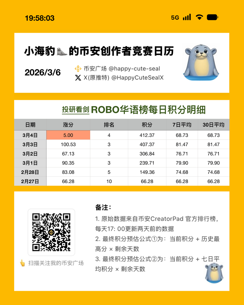 今天的 $ROBO #creatorpad 榜单,在经历了一篇没写、三篇低分、两篇限流后,本海豹🦭终于重新荣归 top3,【虚荣心】再度得到了满足,内心也恢复了 balance again 🙉🤨😭🤣