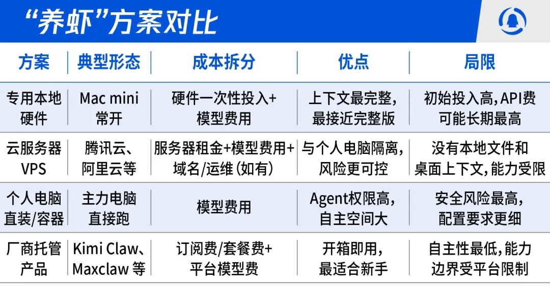 Локальное выделенное оборудование (Mac Mini) является наиболее стабильным, но его стоимость высока; развертывание на облачном сервере обеспечивает безопасность и изоляцию, но его возможности ограничены; прямая установка на компьютер имеет самый низкий порог входа, но самый высокий риск; сервисы, предоставляемые сторонними поставщиками (Kimi Claw, MaxClaw), являются самыми простыми, но их возможности ограничены.
