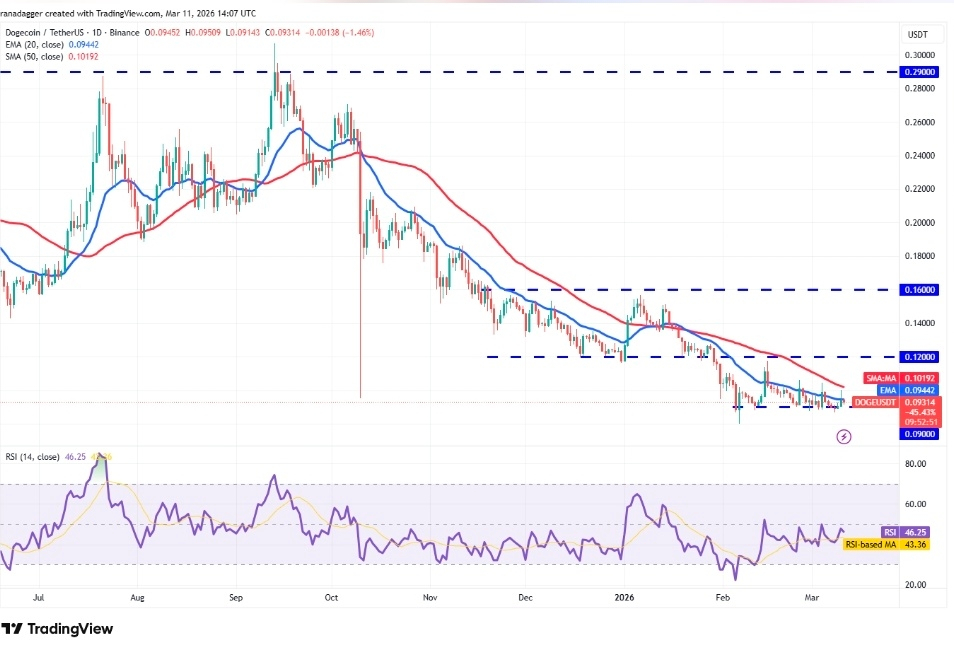 Это говорит о том, что медведи активны на более высоких уровнях. Продавцы пытаются опустить цену Dogecoin ниже уровня поддержки $0.09. Если им это удастся, пара DOGE/USDT может рухнуть до уровня $0.08, а затем до уровня $0.06.