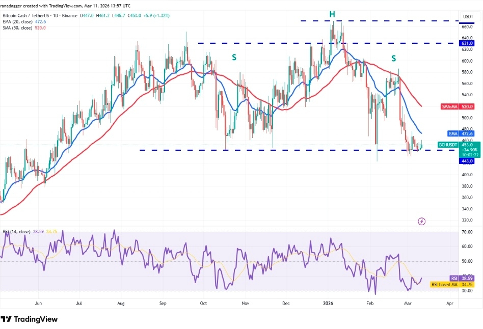 Нисходящая 20-дневная EMA ($472) и RSI в отрицательной области указывают на то, что медведи сохраняют контроль. Если цена Bitcoin Cash резко развернется от 20-дневной EMA, вероятность прорыва ниже уровня $443 увеличивается. Пара BCH/USDT затем завершит медвежью голову и плечи, открывая двери для падения до $375.