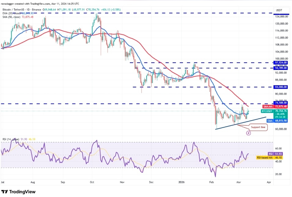 Быки пытаются удержать цену Bitcoin выше 20-дневной экспоненциальной скользящей средней ($68,815). Если им это удастся, пара BTC/USDT может протестировать уровень сопротивления $74,508. Это важный уровень для медведей, так как закрытие выше него завершит бычью восходящую треугольную формацию. Пара может тогда взлететь до