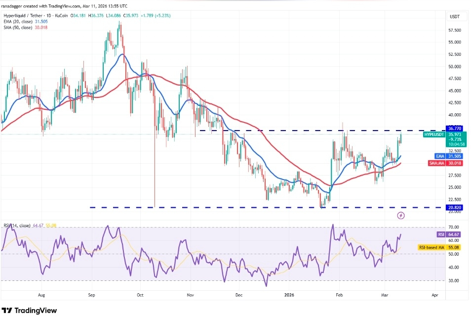 Hyperliquid (HYPE $36.23) отскочил от 50-дневного SMA ($30.01) в воскресенье, указывая на то, что быки покупают на спадах.