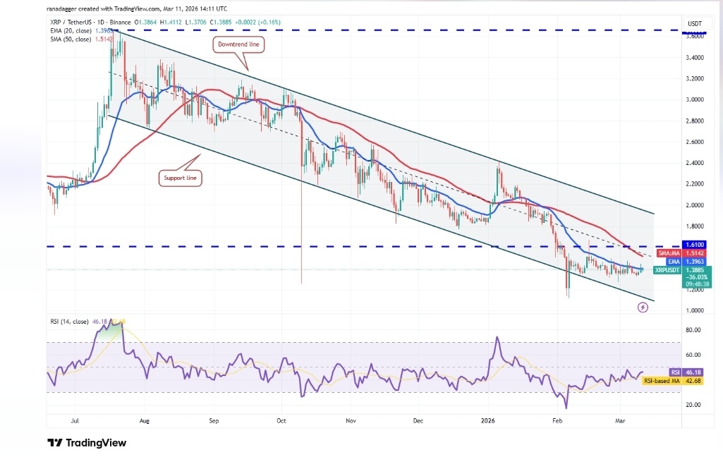 XRP (XRPA $1.38) прорвал 20-дневную EMA ($1.39) во вторник, но длинный фитиль на свечной модели показывает продажу на более высоких уровнях.