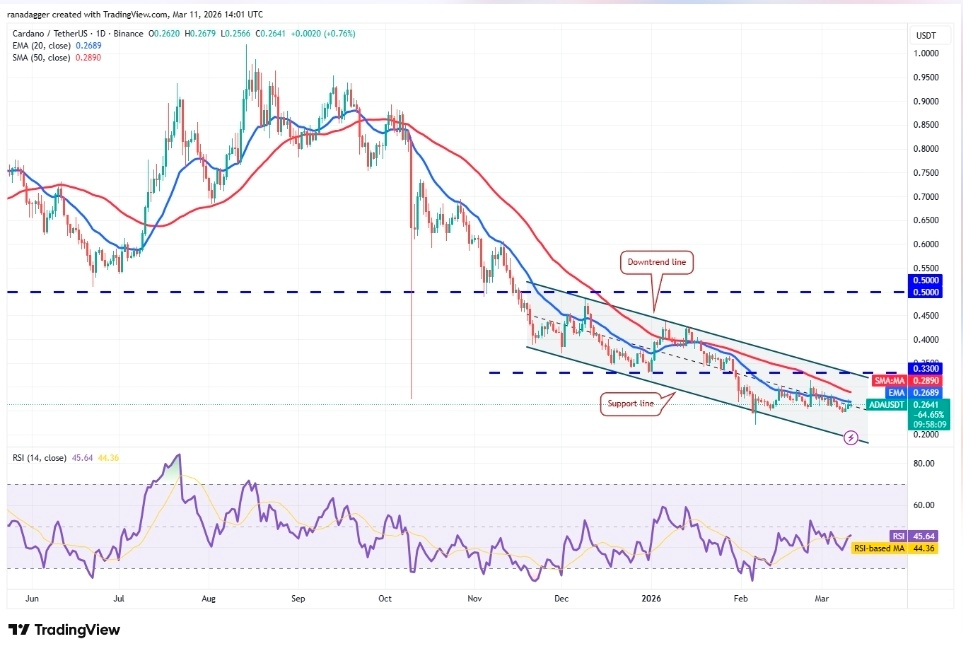 Cardano (ADA $0.26) продолжает торговаться внутри нисходящего канала, указывая на то, что продавцы остаются у власти.