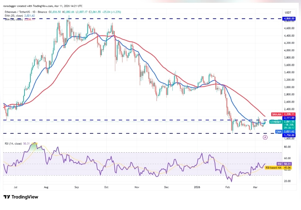 Быки снова пытаются подтолкнуть цену Ether выше уровня сопротивления $2,111 и 50-дневного SMA ($2,208). Если им это удастся, пара ETH/USDT может вырасти до $2,600 и затем до $3,045.