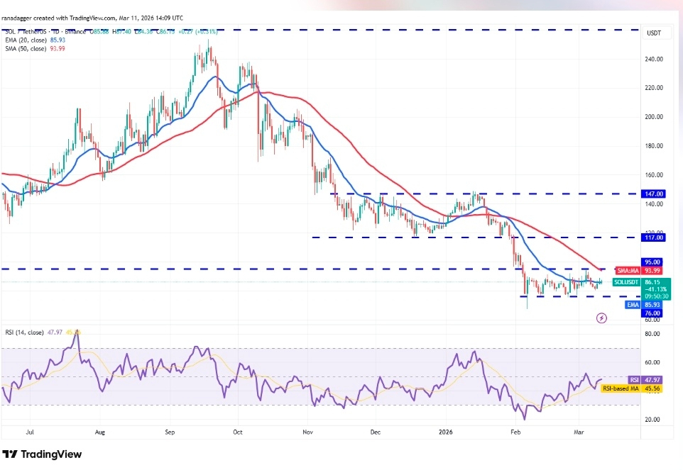 Цена Solana выше уровня $95 для захвата контроля. Пара SOL/USDT тогда может подняться до $117, где ожидается, что медведи сделают стойку.