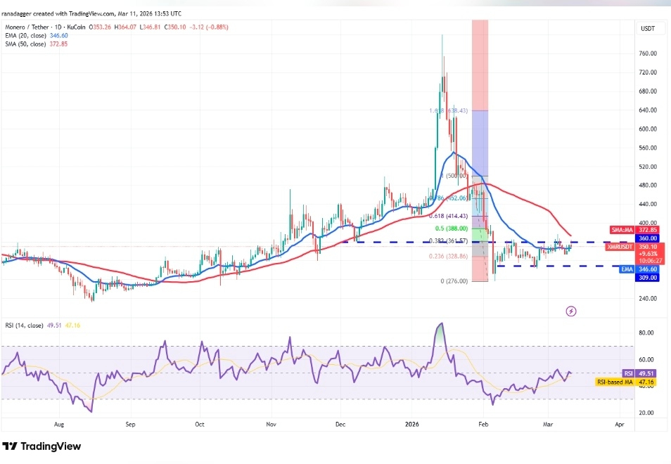 Плоская 20-дневная EMA ($346) и RSI рядом со средней точкой не дают четкого преимущества ни быкам, ни медведям. Если покупатели поднимут цену Monero выше 50-дневного SMA, пара XMR/USDT может набрать momentum и вырасти до уровня коррекции Фибоначчи 61.8% в $414