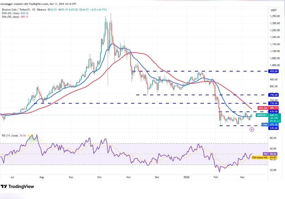 BNB (BNB ▲ $646.70) колебался между уровнями $570 и $670 в течение нескольких дней, указывая на неопределенность относительно следующего направления.