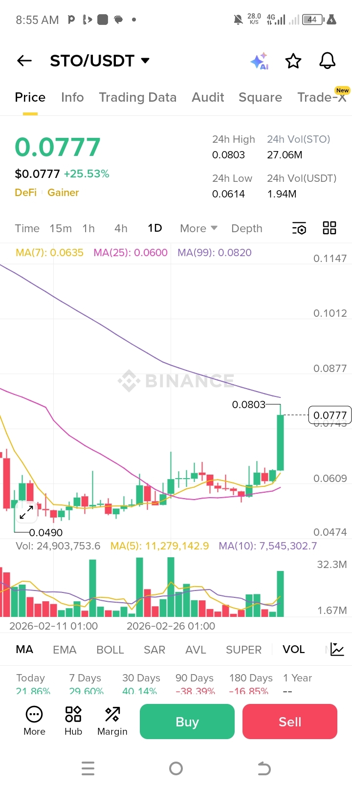 $STO /USDT is one of the hottest gainers lighting up the board with +25.53% in the last 24 hours, currently sitting at $0.07777. Volume exploded to over 27 million STO traded (~$2M+ USDT equivalent), and it's proudly wearing the DeFi Gainer badge.