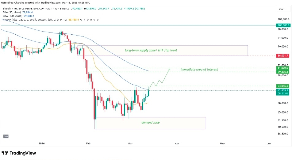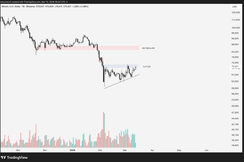 Говоря о потенциальном повторном тестировании $74,000, крипто-трейдер Арди сказал, что биткойн должен превратить этот уровень в поддержку и вернуть область $85,000, чтобы восстановить бычий тренд на более высоком временном интервале (HTF).