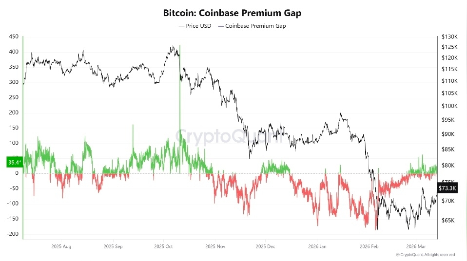 разрыв, который измеряет разницу в цене между биткойном на Coinbase и глобальных биржах, в настоящее время составляет +35.4, отмечая его первый положительный результат почти за десять недель.