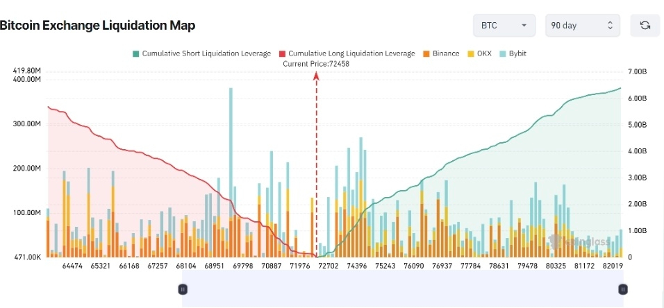 Кластеры ликвидности BTC находятся выше $75,000. Биткойн в настоящее время пытается вернуть свою 100-дневную скользящую среднюю на дневном графике, отмечая первое значительное повторное тестирование этого уровня с тех пор, как он стал сопротивлением 20 января.