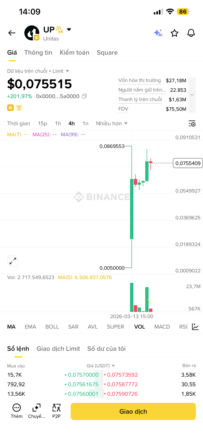 Đồng UP đang trải qua một đợt biến động cực đại (Volatility). Nhìn vào biểu đồ khung 4H, chúng ta thấy một cột nến xanh "thẳng đứng" đẩy giá từ vùng $0,005 lên tới đỉnh $0,0869 (tương đương mức tăng hơn 1.600%).