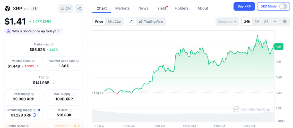XRP торгуется по цене $1.41 согласно CoinMarketCap на 15 марта, при этом трейдеры сосредоточены на симметричном треугольнике, который аналитик Али Мартинес отметил на месячном графике. Кумулятивный объем дельты фьючерсных участников за 90 дней достиг своего максимума с ноября 2024 года, сигнализируя о раннем накоплении согласно данным производных Bloomberg.