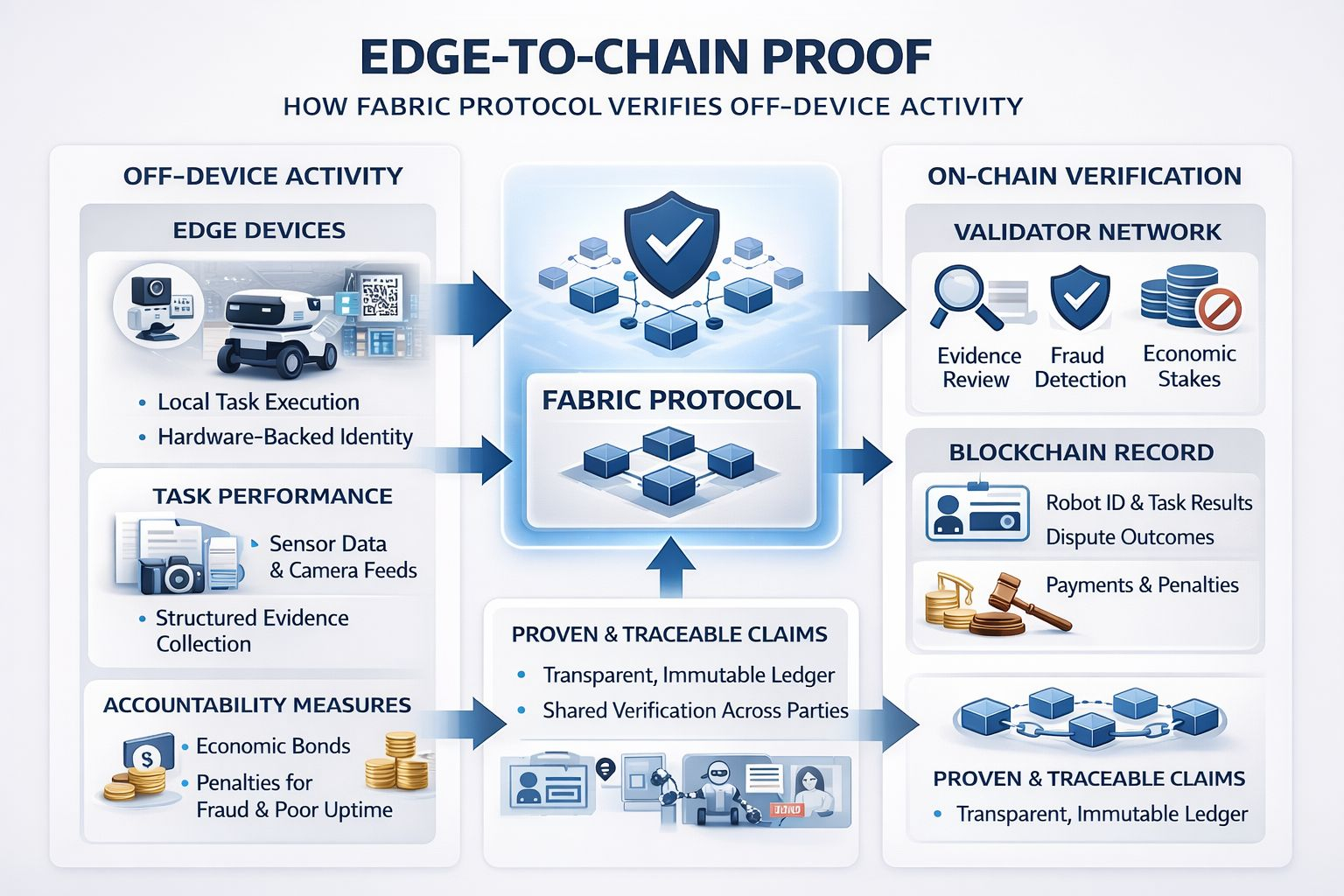 I keep coming back to a simple problem here. A blockchain can record claims and payments and timestamps but it cannot directly watch a robot move through a warehouse or see what an edge device actually sensed in the moment. My first instinct used to be that “proof” meant a chain somehow knowing everything for itself. The more I look at Fabric the more I think that is the wrong model. Fabric’s idea feels closer to building a trustworthy bridge between a messy physical event and a durable onchain record so other people can judge what likely happened without having to rerun the whole event themselves.