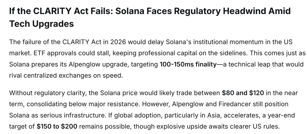 Если закон CLARITY не будет принят, Solana может потерять часть своего институционального импульса. Одобрение ETF может занять время, и профессиональные деньги могут быть отложены. Solana также готовится к предстоящему обновлению Alpenglow, нацеленному на финализацию от 100 до 150 мс. Это большое техническое улучшение, сопоставимое с тем, что могут делать традиционные биржи.
