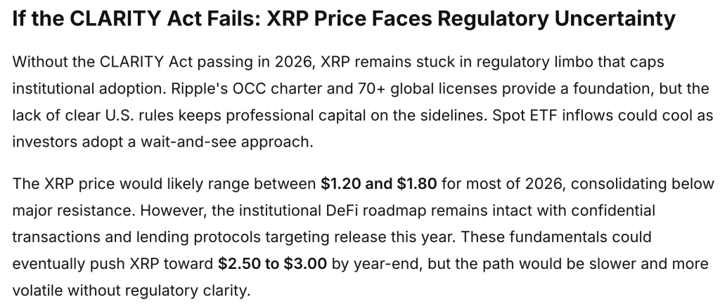 Если закон CLARITY не будет реализован, XRP, скорее всего, останется в регуляторной серой зоне с широкими колебаниями цен. Наличие у Ripple чартер OCC и более 70 лицензий по всему миру дает ему прочную основу, но отсутствие четких правил в США вызывает отсутствие интереса со стороны институциональных инвесторов. По мере того как мы движемся к 2026 году, XRP, скорее всего, будет торговаться в диапазоне от $1.20 до $1.80.
