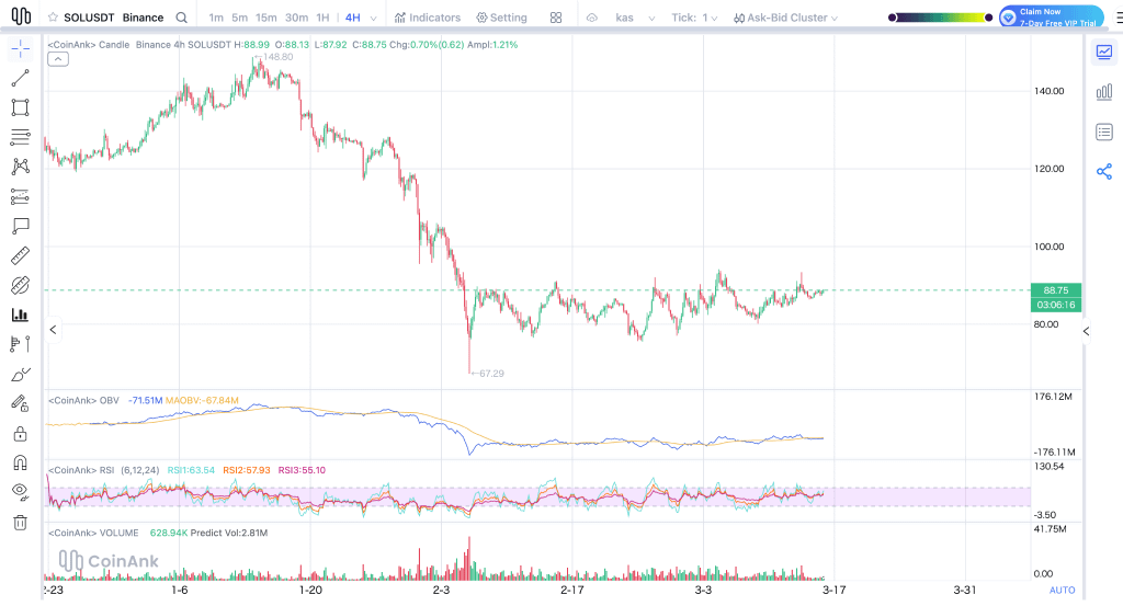 Показания RSI показывают быстрый RSI на уровне 63.54, средний и медленный — на уровне 57.93 и 55.10, что указывает на нарастающий импульс. Объем составляет 628,940 SOL, что значительно ниже прогнозируемых 2.81 миллиона.