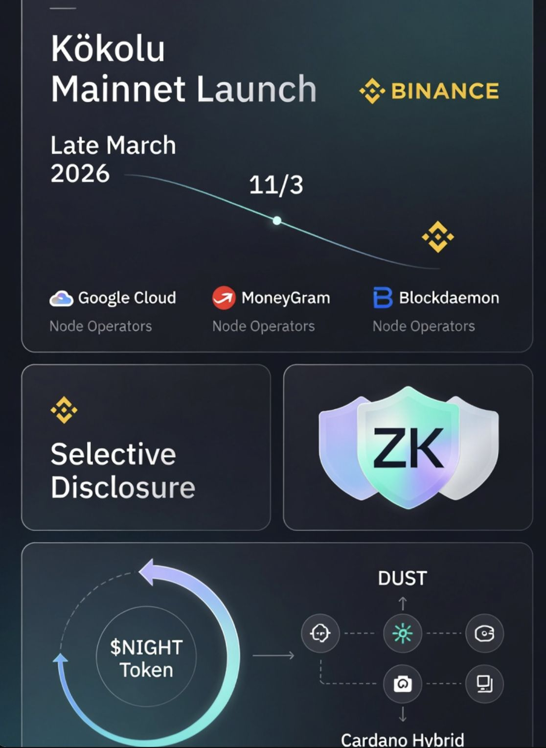 Sau khi chính thức niêm yết spot trên Binance ngày 11/3/2026, @MidnightNetwork Midnight Network đang thu hút sự chú ý mạnh mẽ từ cộng đồng và nhà đầu tư tổ chức. Với giá giao dịch hiện khoảng $0.050 và circulating supply 16.6 tỷ trong tổng cung 24 tỷ, token $NIGHT đã khẳng định vị thế là tài sản governance cốt lõi.Điểm nhấn lớn nhất là federated mainnet sắp ra mắt cuối tháng 3/2026 trong Kūkolu phase. Mạng lưới sẽ được vận hành bởi nhóm trusted node operators danh tiếng: Google Cloud, MoneyGram, Blockdaemon, Shielded Technologies cùng các đối tác khác. Mô hình này đảm bảo tính ổn định và tuân thủ cao trong giai đoạn đầu, trước khi chuyển dần sang phân quyền đầy đủ.Công nghệ zero-knowledge selective disclosure của Midnight cho phép developer xây dựng ứng dụng DeFi, RWA và identity mà vẫn kiểm soát chính xác mức độ minh bạch một sự cân bằng hoàn hảo giữa privacy và quy định. $NIGHT unshielded tự động tạo ra DUST shielded để thanh toán phí giao dịch private, mang lại trải nghiệm mượt mà và chi phí dự đoán được.Là partner chain của Cardano, Midnight không chỉ kế thừa security vượt trội mà còn mở rộng hệ sinh thái hướng tới doanh nghiệp và tổ chức tài chính. Các nhà đầu tư đang đánh giá cao mô hình này nhờ khả năng ứng dụng thực tiễn trong môi trường quy định ngày càng chặt chẽ.Với mainnet chỉ cách vài tuần, đây chính là thời điểm lý tưởng để theo dõi sự phát triển của một trong những dự án privacy thế hệ 4 đầy tiềm năng nhất.@MidnightNetwork $NIGHT