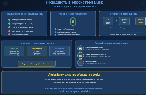 На мой взгляд, самая большая ошибка в понимании ликвидности — это думать, что она появляется сама собой, если просто создать токен и пул. Настоящая ликвидность — это следствие доверия: доверия к активу, доверия к инфраструктуре, доверия к тому, что правила игры не изменятся завтра. Dusk строит все эти компоненты системно: техническую инфраструктуру для приватного и эффективного маркет-мейкинга, регуляторный фреймворк для комплаентного участия институтов, экономические стимулы для долгосрочных маркет-мейкеров. Это не быстрый путь, это правильный путь. И когда токенизированные активы станут мейнстримом, ликвидность будет там, где есть доверие. А доверие будет там, где есть архитектура для его поддержки.