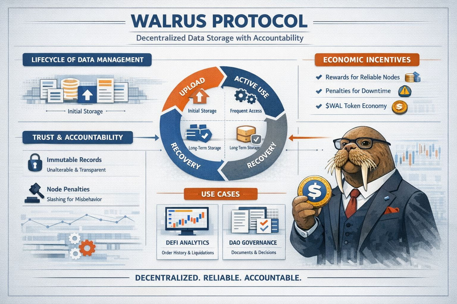 Ключевое отличие Walrus заключается в том, что хранение данных здесь рассматривается как активная услуга, а не как пассивное состояние. Данные имеют жизненный цикл: момент загрузки, период активного использования, архивирование, восстановление в случае сбоев. В традиционных децентрализованных сетях эти процессы либо не формализованы, либо полностью зависят от добросовестности отдельных участников. В Walrus каждый этап подкреплен экономической логикой через $WAL.