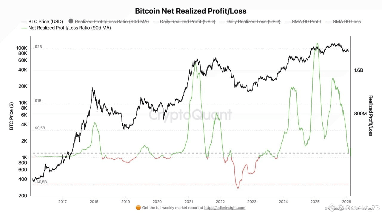 Чистая реализованная прибыль/убыток по #BTC рухнула на 97% и фактически вернулась к нулю. Такие данные приводит #Cryptoquant. Это означает, что участники рынка почти перестали фиксировать прибыль - и так же почти перестали фиксировать убыток. Денег, которые обычно заходят в рынок через массовую фиксацию, сейчас просто нет.