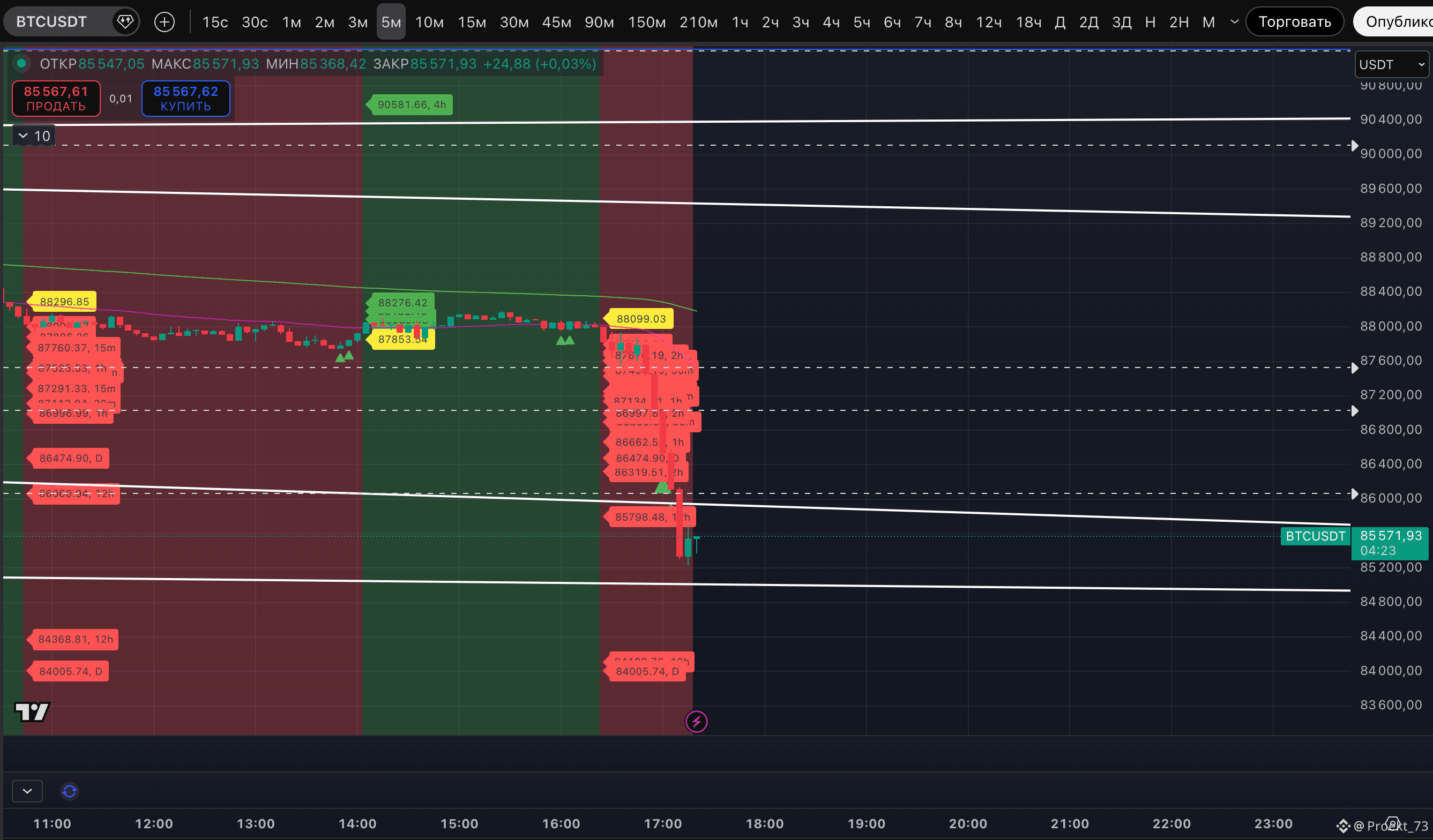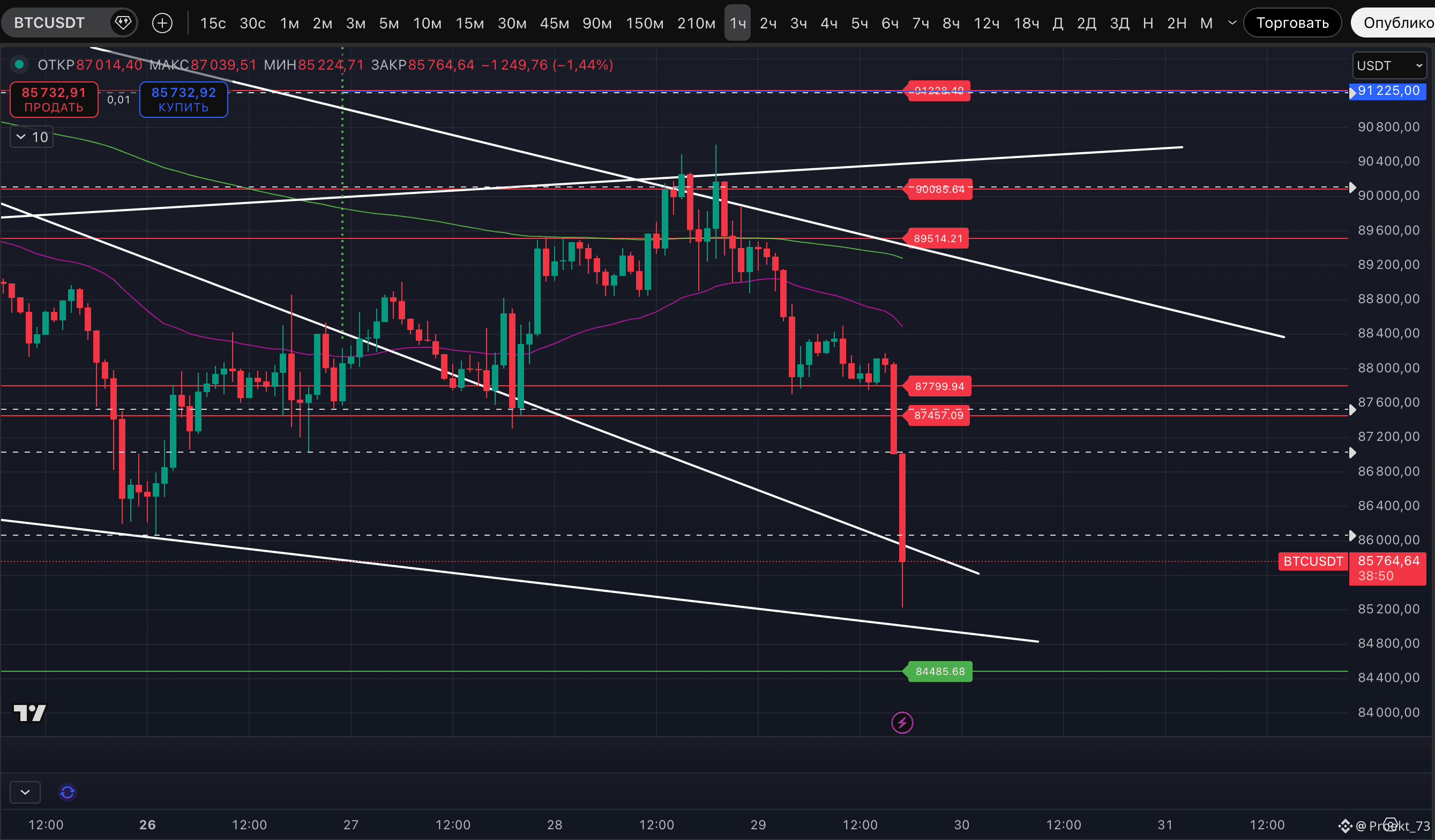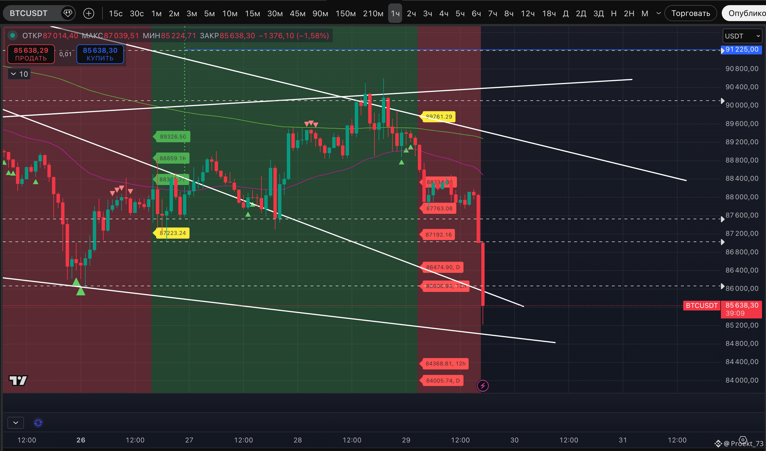 "По горизонтальным уровням ситуация прежняя - для быков крайне важно удерживать диапазон 87 457-87 799$. Иначе цену могут импульсно потащить к следующей поддержке уже на 84 485$."