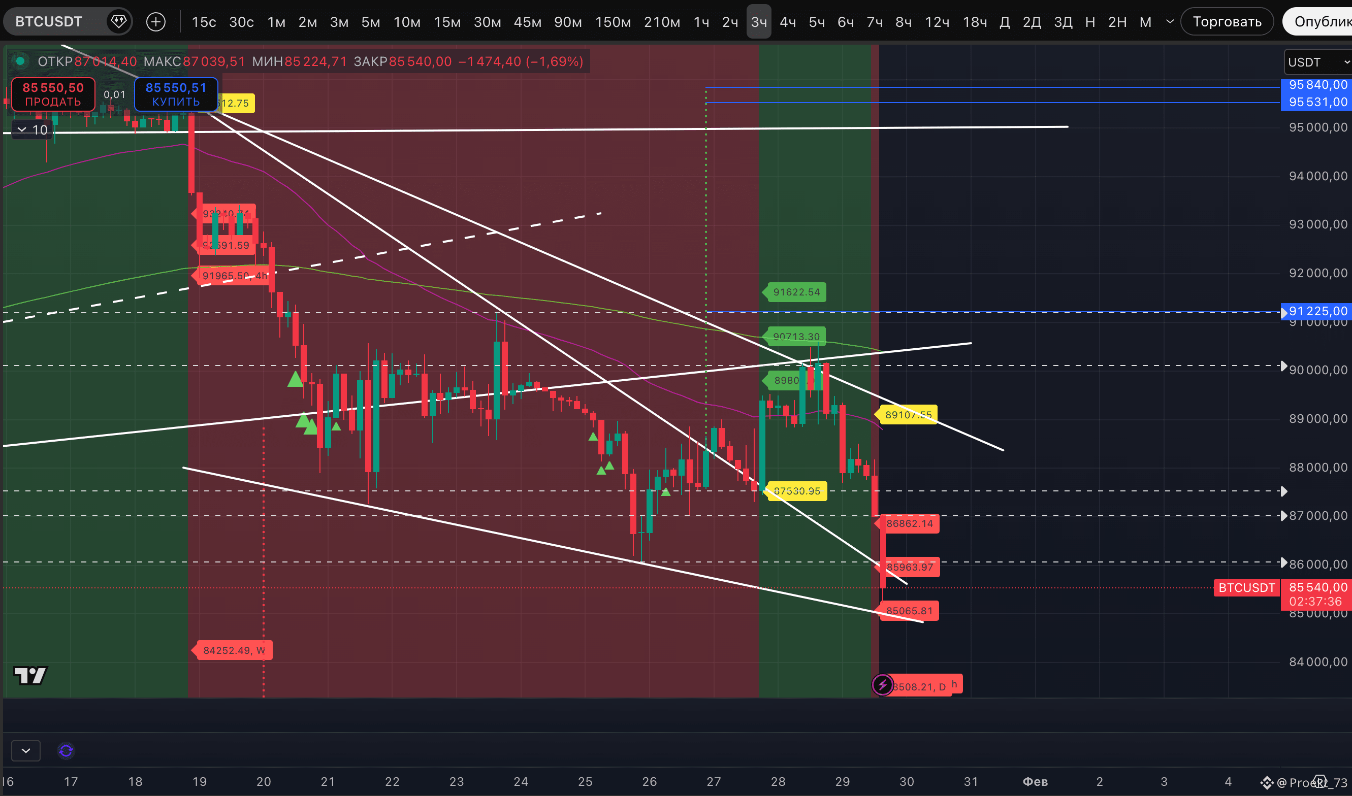 Плохие новости для быков - на BTC и ETH график импульсно вернул даунтренды на 3-часовом ТФ. Как писали в сегодняшнем обзоре, это открывает для #BTC поход к импульсному снижению, которое сейчас и развивается. Цена в моменте провалилась уже ниже 86 000$, сняв ликвидность за лоем 26 января. Лой на сейчас - 85 224$.