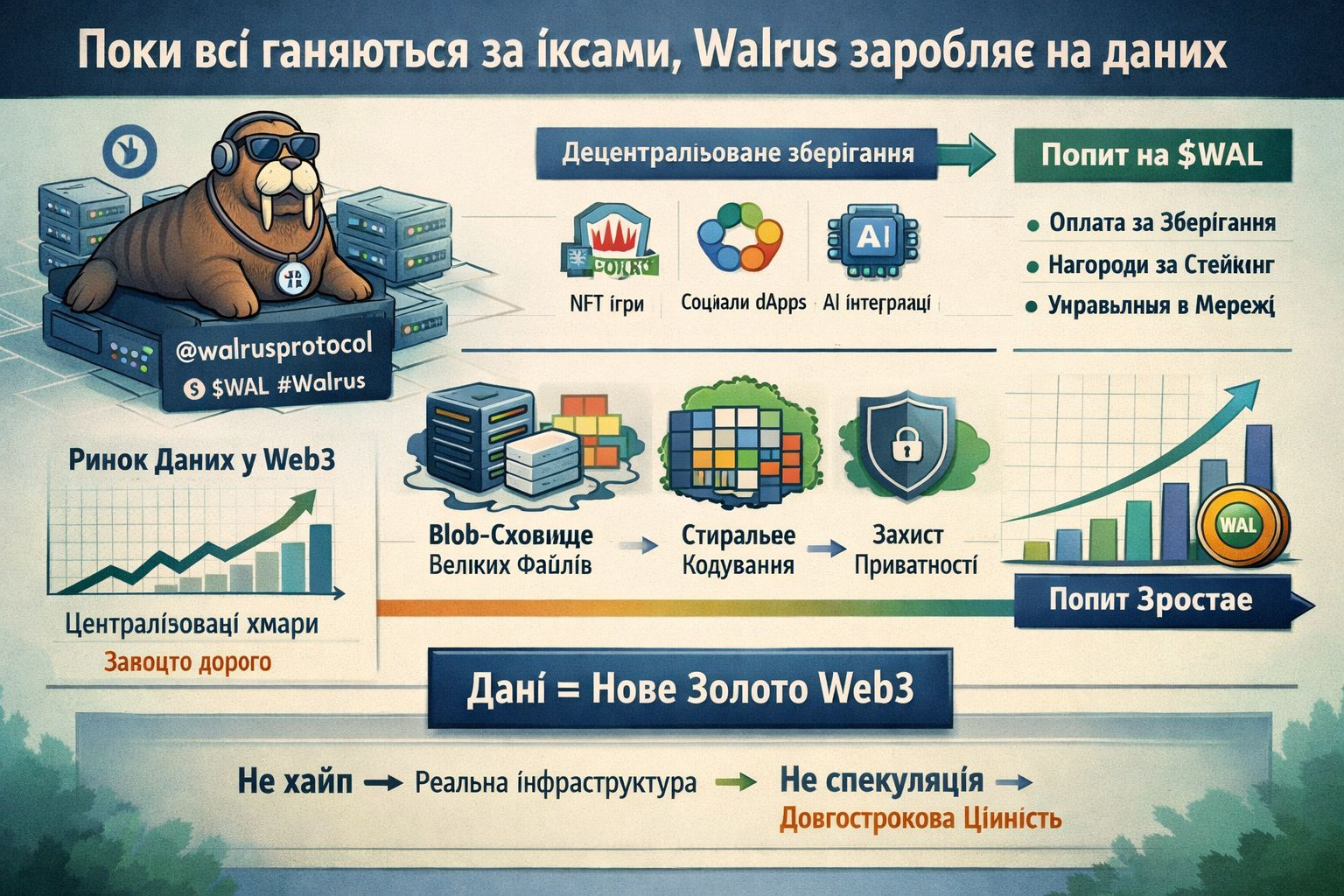 Когда говорят о спросе на данные в Web3, часто это звучит абстрактно, будто речь идет о чем-то далеком. Но если посмотреть внимательнее, данные уже сейчас становятся одним из самых дефицитных ресурсов в криптоэкосистеме. Каждая NFT-коллекция с динамическими метаданными, каждая ончейн-игра, каждый social dApp или AI-продукт — это не просто транзакции, это гигабайты информации, которые нужно где-то хранить. И тут большинство проектов сталкивается с реальностью: либо централизованные облака с риском цензуры, либо технически ограниченные блокчейны. Именно в этот момент появляется Walrus.