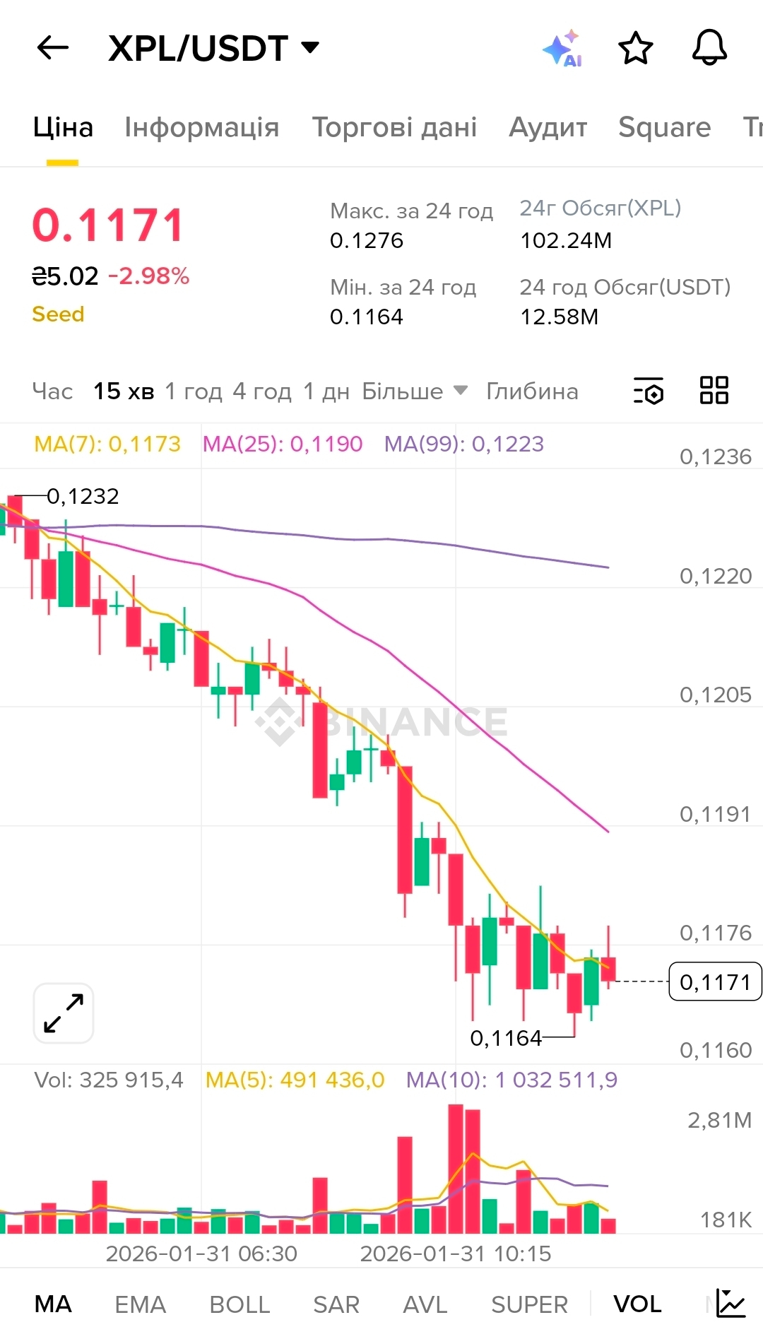 Текущая динамика $XPL демонстрирует не агрессивный памп, а методичное рост. Цена удерживается выше 0,116 USDT, пробила 0,1232 и консолидируется возле 0,1171. Объемы стабильно превышают 12 млн USDT в день, распределены равномерно без панических продаж. Скользящие MA(7), MA(25), MA(99) в бычьей конфигурации, цена их не пробивает.
