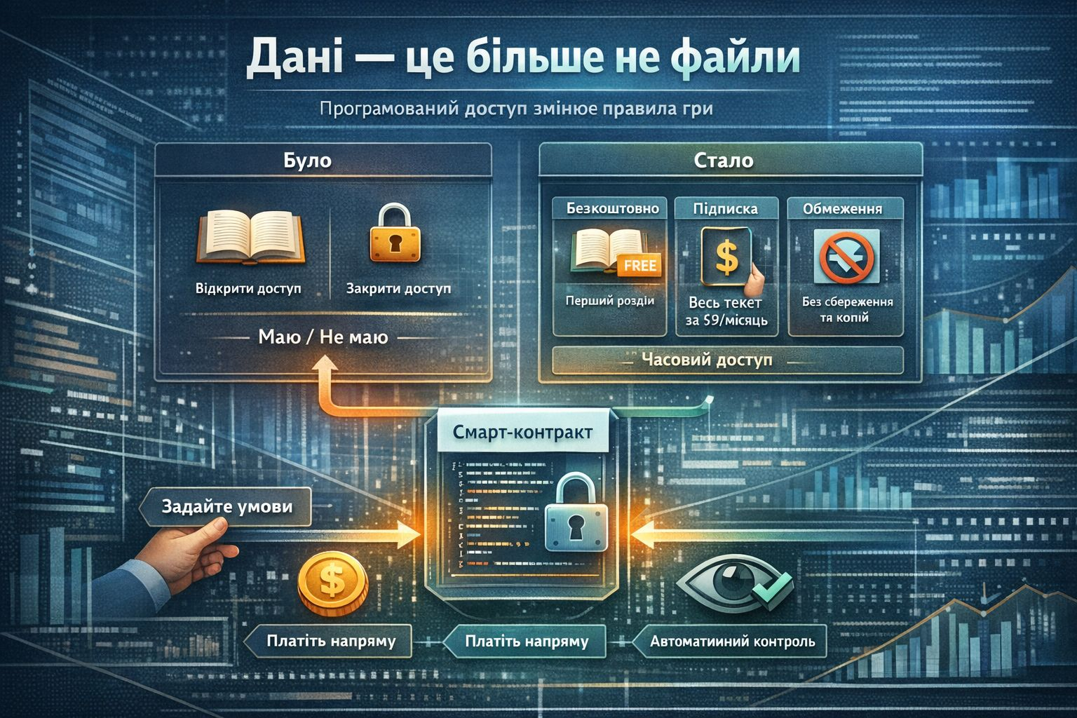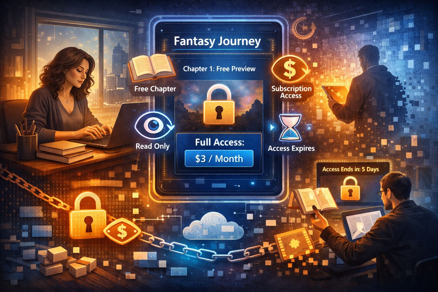 Уявіть, що ви письменниця і написали книгу. Раніше у вас було лише два варіанти: або віддати рукопис видавництву і втратити контроль, або викласти його у відкритий доступ і втратити монетизацію. Програмований доступ пропонує третій шлях. Ви завантажуєте текст у Walrus і задаєте умови через смарт-контракт: перший розділ доступний безкоштовно, повний текст — за кілька доларів на місяць, читання лише онлайн, без копіювання, доступ автоматично закінчується після завершення підписки. Ніхто не повинен вам довіряти, ніхто не може змінити правила заднім числом — код просто виконує умови.