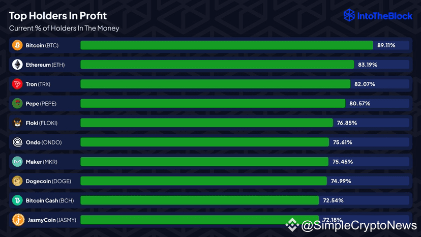 IntoTheBlock также отметил, что адреса, находящиеся в нереализованной прибыли, в основном сосредоточены в BTC (89%) и ETH (83%)
