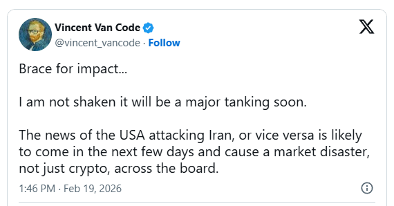 In that climate, software developer and crypto commentator Vincent Van Code issued a blunt warning to XRP holders, urging them to brace for what he believes could be a significant downturn. His remarks reflect a broader fear circulating in financial circles: escalating tensions between the United States and Iran could trigger a cross-market shock event.