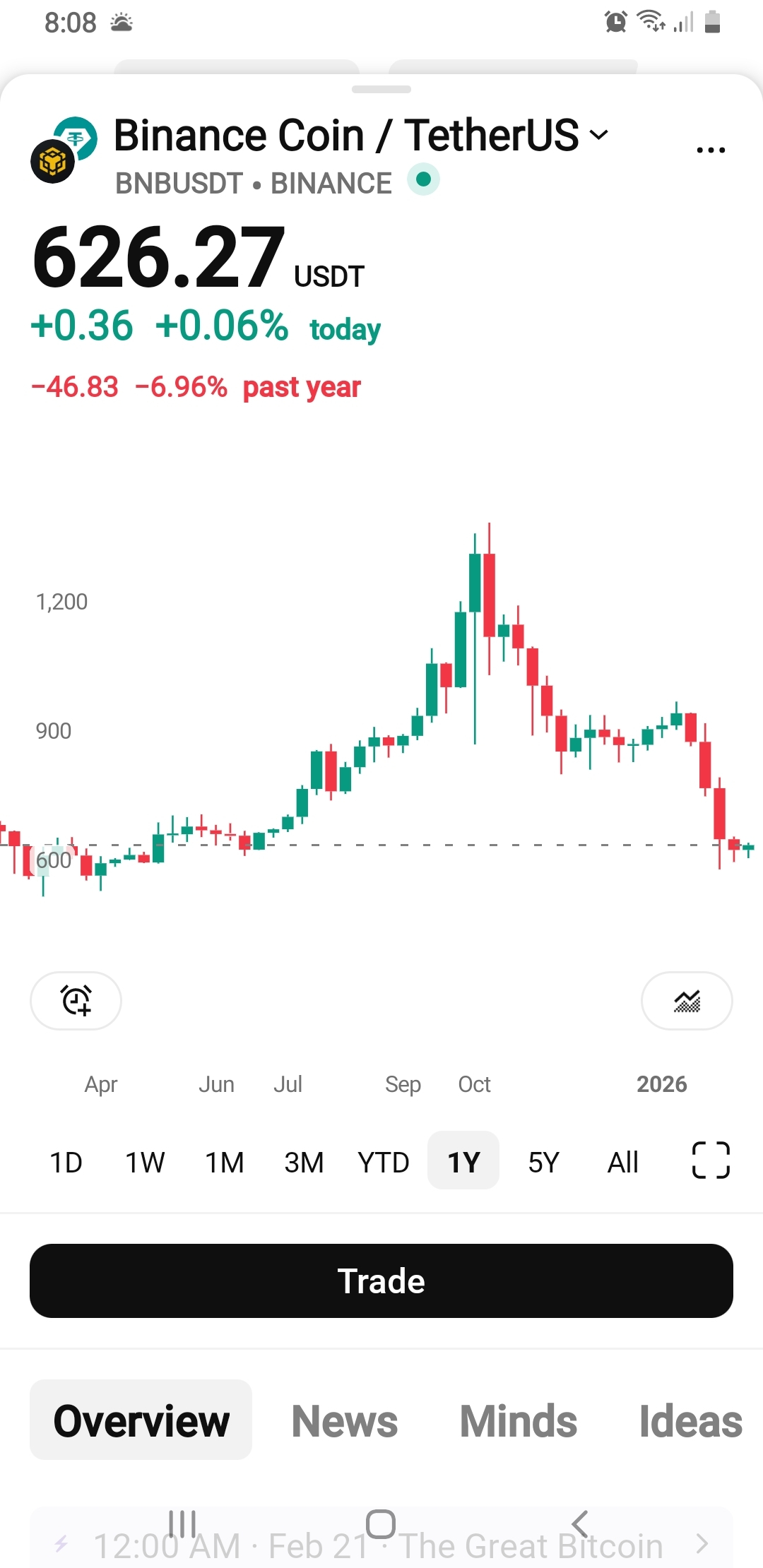 If this support level holds, we could see a short-term bounce or consolidation. However, if 600 USDT breaks with strong volume, the price may continue moving downward. Overall, the trend on the 1-year timeframe still looks weak unless BNB starts making higher highs and higher lows again.