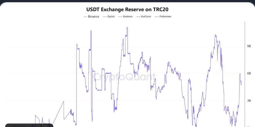 Following the recent market pullback that pushed Bitcoin and Ethereum toward key technical support levels, on-chain data shows a notable structural response. Binance’s USDT Exchange Reserve on the TRC20 network increased significantly, rising from 385M on December 24 to approximately 5.2B.