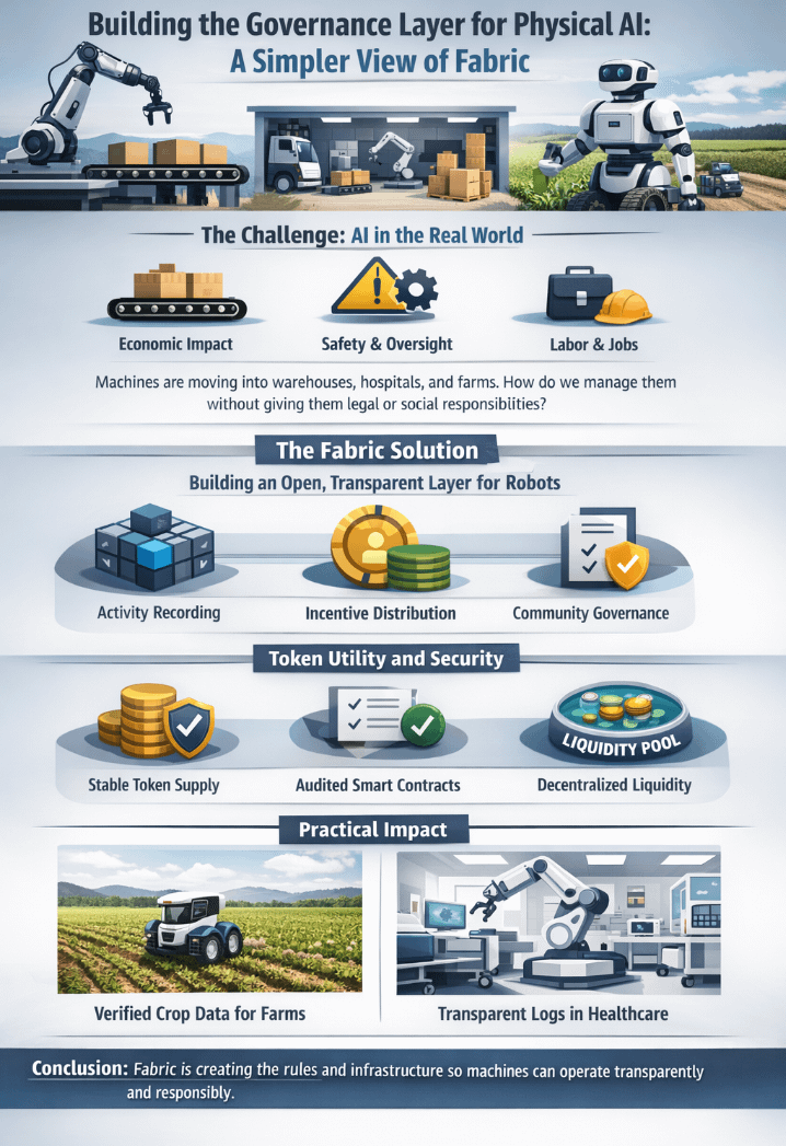 Artificial intelligence is no longer limited to chatbots or image tools. It is moving into the real worldinto warehouses, hospitals, farms, and factories. Robots are beginning to move goods, assist patients, harvest crops, and assemble products. The real challenge is not whether these machines can function properly, but how we manage and supervise them once they become part of our economic system. Machines do not have legal responsibility, moral judgment, or social awareness. Yet they are starting to produce economic value and influence safety and labor markets. This creates a gap in our existing systems, which were designed only for humans. Fabric aims to solve this problem. It is not a robotics company and not just another AI token. Instead, it focuses on building infrastructure that allows intelligent machines to operate in a transparent, accountable, and economically trackable way. The idea is similar to how public blockchains made financial transactions visible and verifiable. Fabric provides a coordination layer where machine activities can be recorded, monitored, and measured without giving robots legal identity. In this system, the token is not meant for speculation; it works as a utility tool that helps verify actions, align incentives, and allow community governance.
