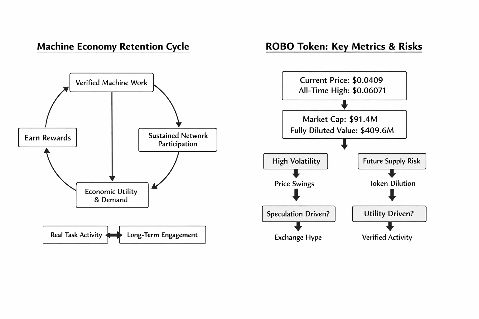 I remember the first time I tried to trade a machine economy story on narrative alone. It looked clean on paper, the market loved the idea for about a week, and then the same problem showed up that usually kills these setups: nobody could tell whether the network was creating real economic activity or just recycling attention. That’s the frame I’m using with Fabric. Not “robots are interesting.” Not even “proofs are interesting.” The real question is whether crypto can verify that a machine actually did useful work, and whether that verification is strong enough to keep operators, developers, and token holders engaged after the listing pop fades. That’s the retention problem. And for traders, that matters more than the slogan. The risk is not subtle here. ROBO is trading around $0.0409, down about 7.5% on the day and 8.9% on the week, with roughly $46.7 million in 24 hour volume against a market cap near $91.4 million. Fully diluted value sits much higher, around $409.6 million, which tells you straight away that future supply still matters. CoinGecko also shows the token hit an all time high of $0.06071 on March 2, 2026, then pulled back hard within days. That’s not the chart of a settled market. It’s the chart of a new asset still looking for a real clearing price while speculation runs ahead of operating proof. If you’re eyeing this, that volatility is not background noise. It is the trade.