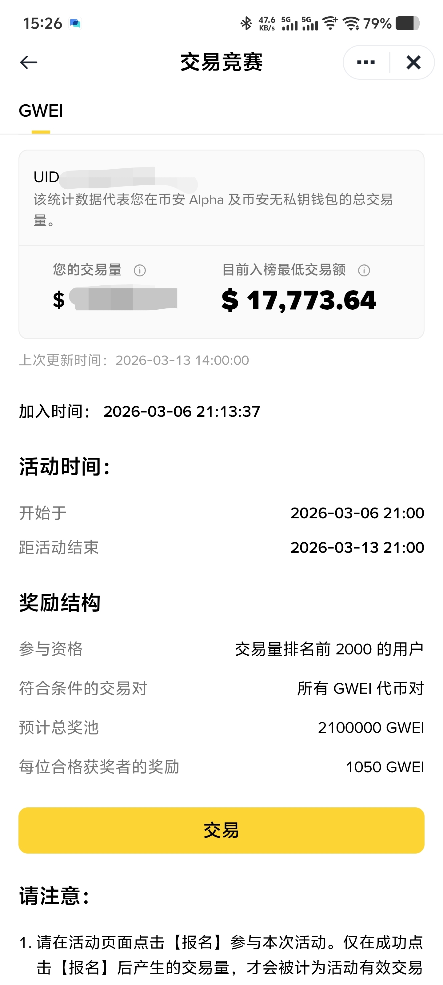 币安广场的兄弟们,ETHGas(GWEI)交易竞赛第一批正火热进行中!活动从2026年3月6日21:00(UTC+8)开跑,到今晚3月13日21:00(香港时间9点)才结束,还有几个小时冲刺时间!奖励池高达210万枚GWEI,前2000名按买入量平分,每人至少1050枚。