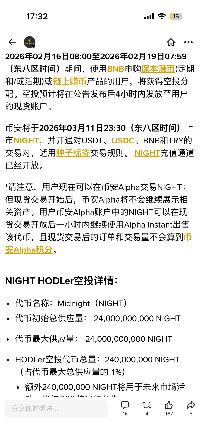币安在昨天上线第61期hodler 空投项目,midnight@MidnightNetwork ,代币为$NIGHT