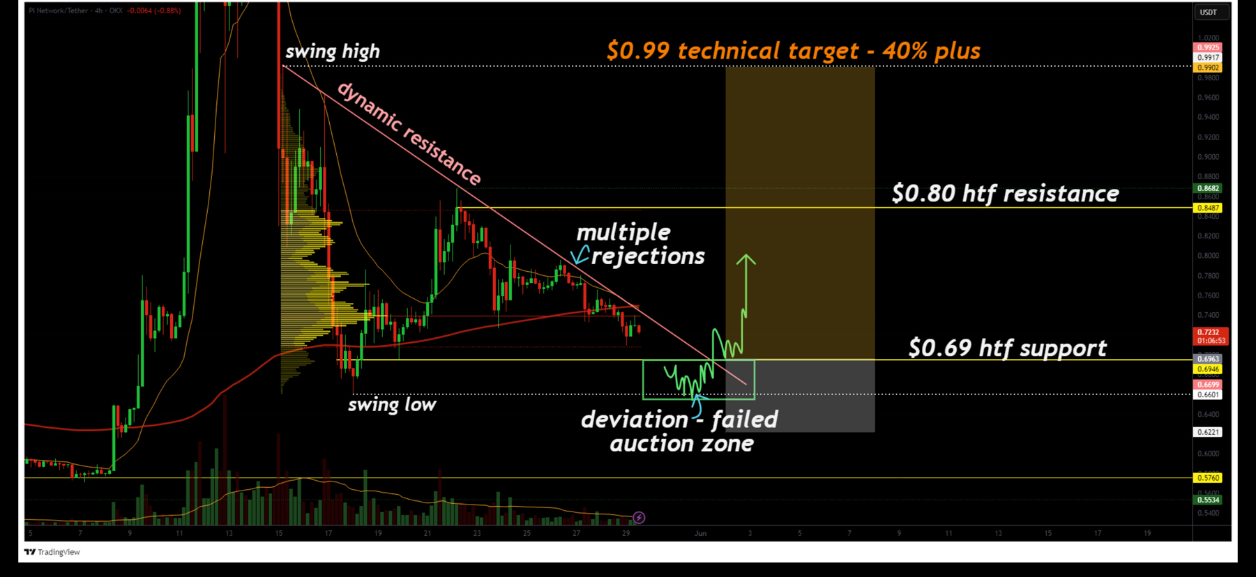 In the short term, PI appears to be trading inside a consolidation range, showing weak momentum after previous volatility. The market is currently waiting for a catalyst such as exchange listings or ecosystem updates.