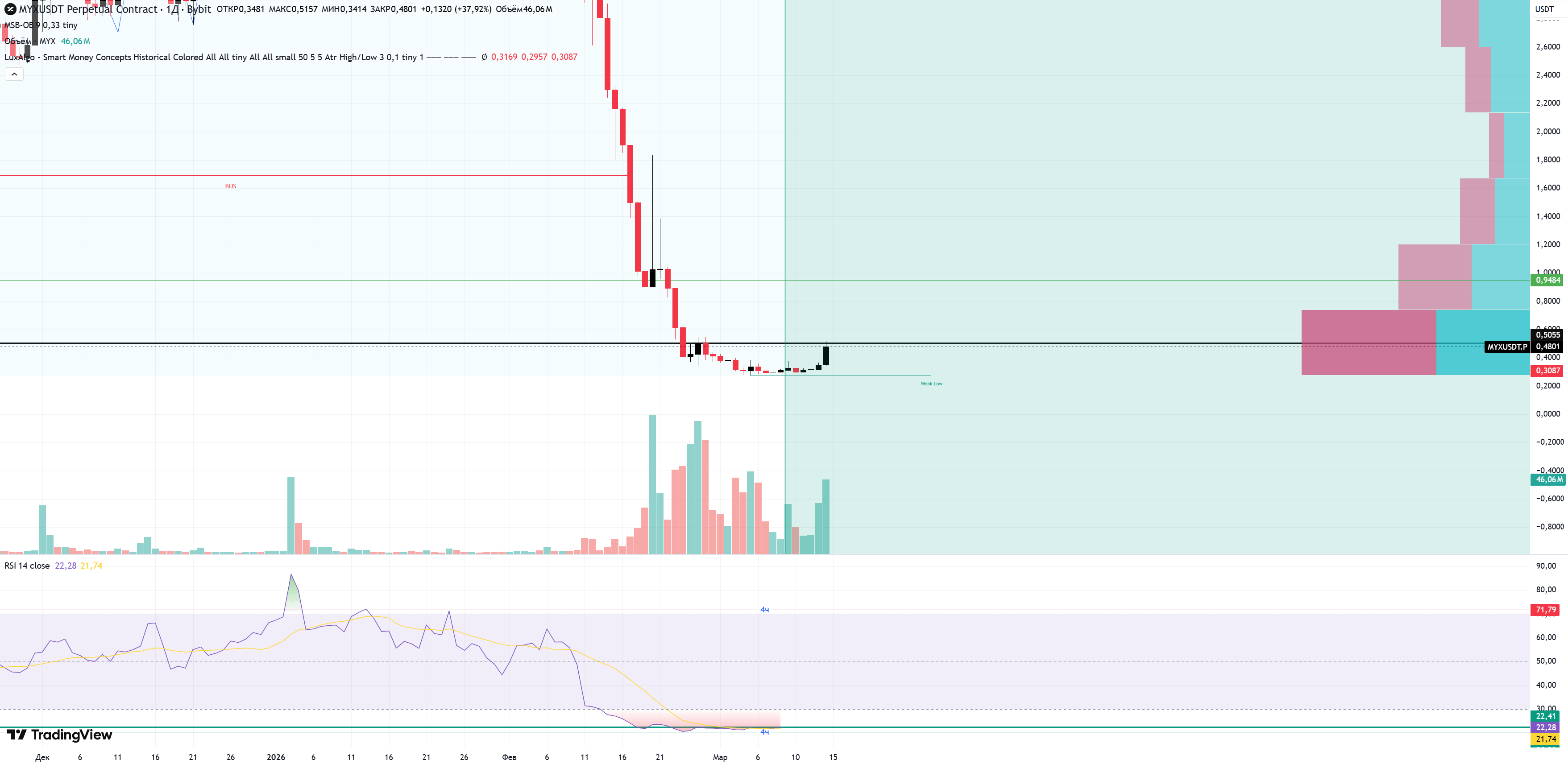 Монета $MYX сильно перепродана на дневном графике и имеет огромный потенциал для отскока (до зоны 0.50+). Однако из-за риска сбора ликвидности внизу, покупать прямо сейчас опасно. Оптимальная стратегия — разместить лимитные ордера на покупку в районе $0.2850-$0.2900 и ждать окончательного выноса вниз перед ростом.