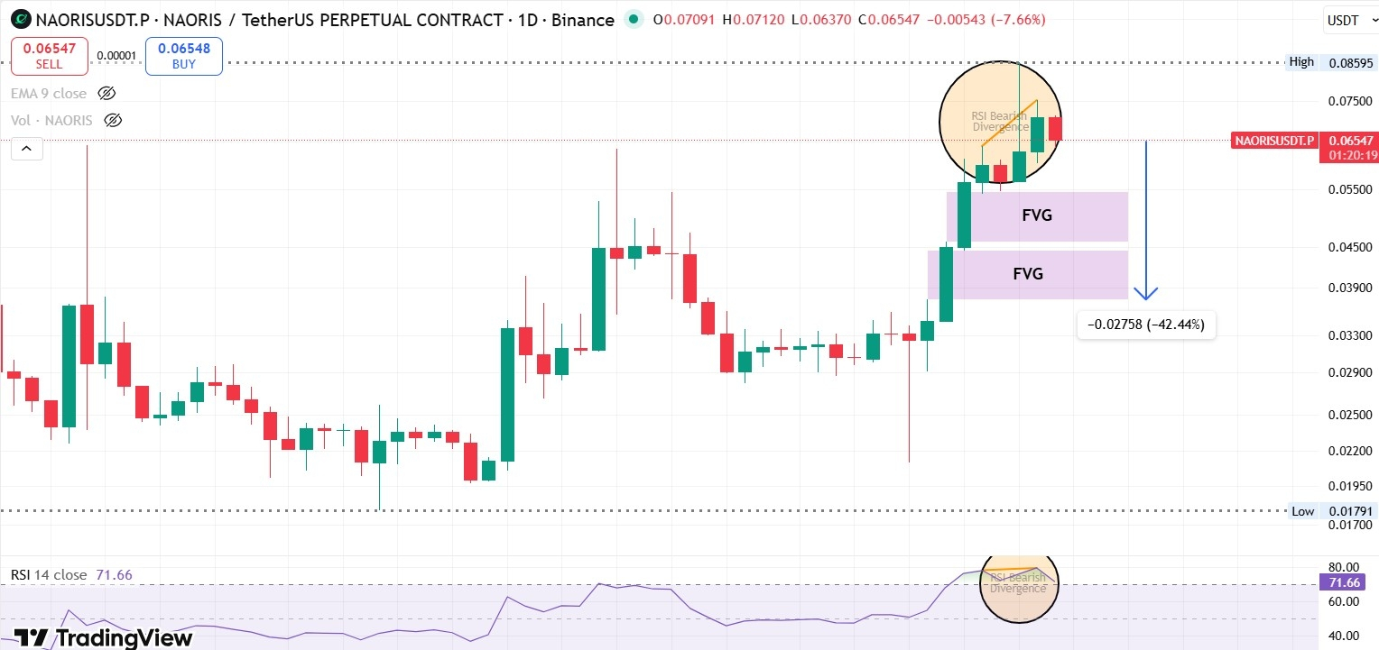 Bearish Targets: If $NAORIS fails to reclaim the $0.062 resistance, the daily chart could shift bearish. A breakdown below $0.052 support may lead to a decline toward $0.047, with a deeper bearish target near $0.040 where previous consolidation zones exist.
