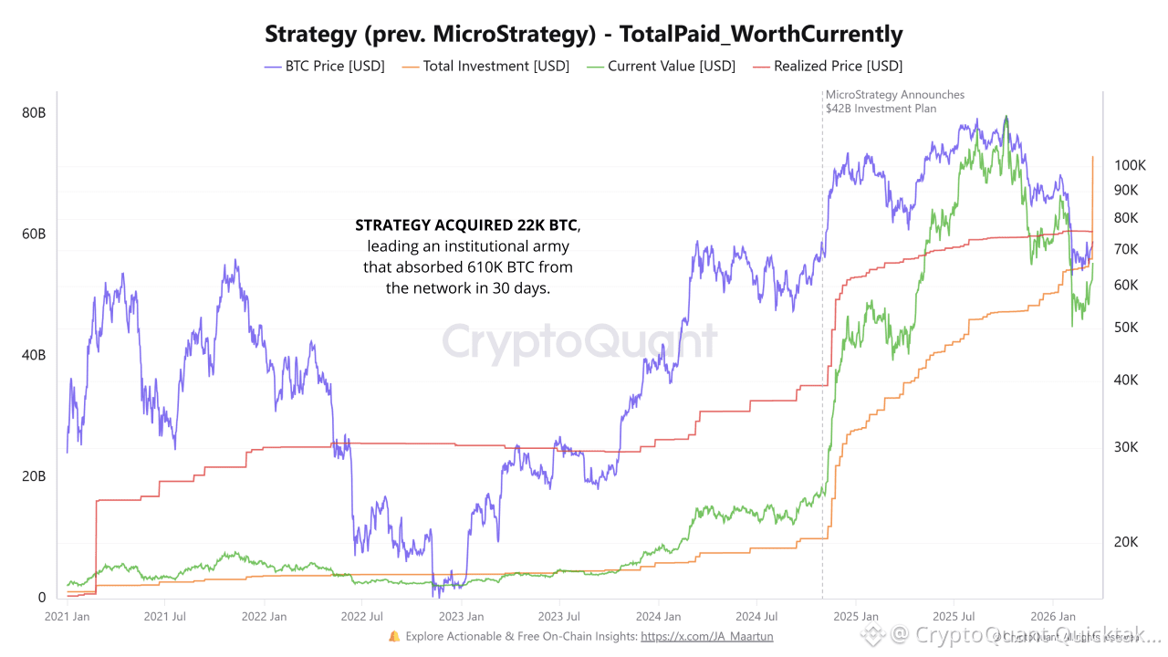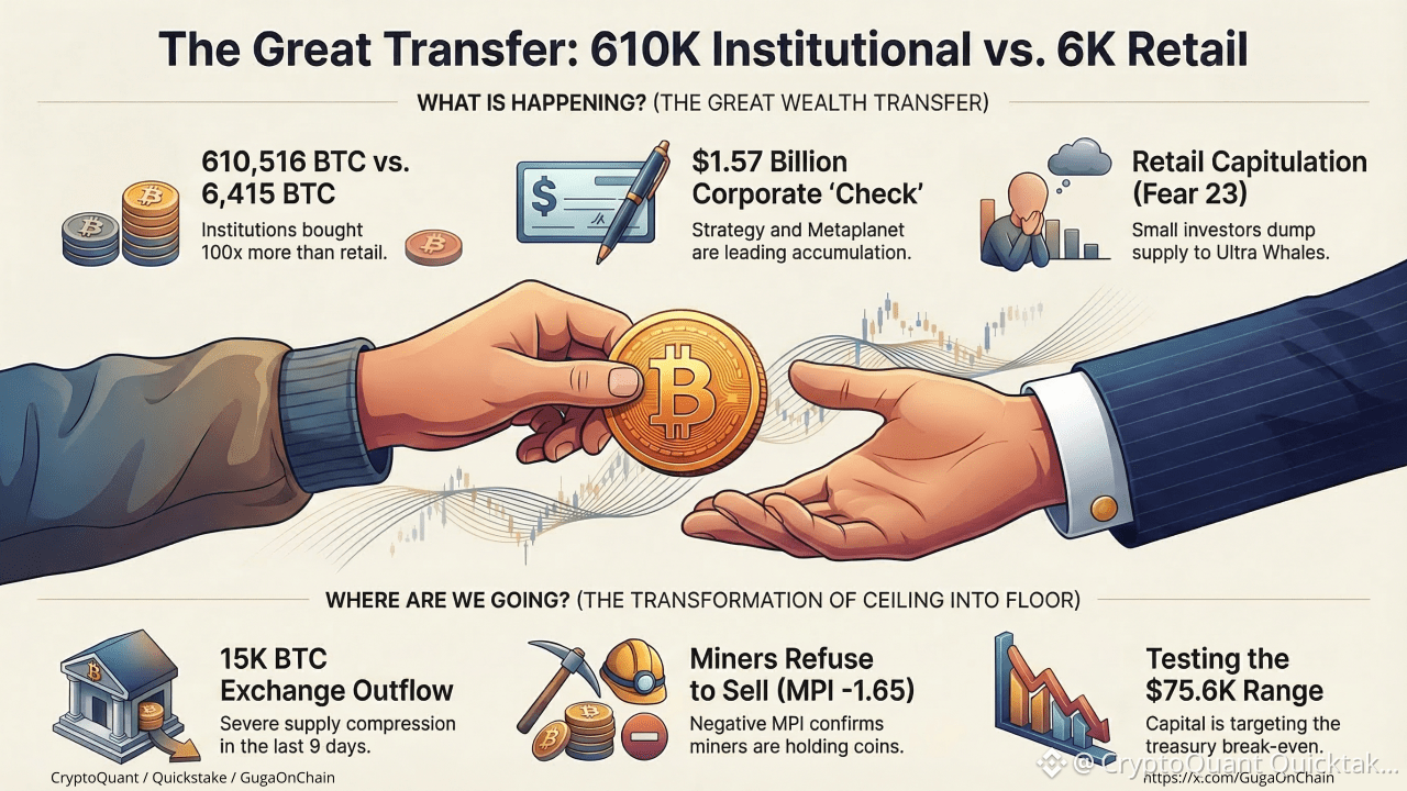 The on-chain "zoom out" shows one of the largest wealth transfers of the cycle. While global retail, reflected by the Korea Premium Index, capitulates (-0.555) amid a sentiment of Extreme Fear (23), North American institutions and large corporate treasuries are absorbing the positions. The statistical chasm is monumental: in the last 30 days, large investors accumulated an impressive 610,516 BTC against a meager 6,415 BTC from retail. Strategy just acquired 22,337 BTC with a $1.57 billion "check", Metaplanet adds $255M, and the Ultra Whales (>10K BTC) are accumulating aggressively — +24.07k BTC —, absorbing the supply dumped by smaller investors.