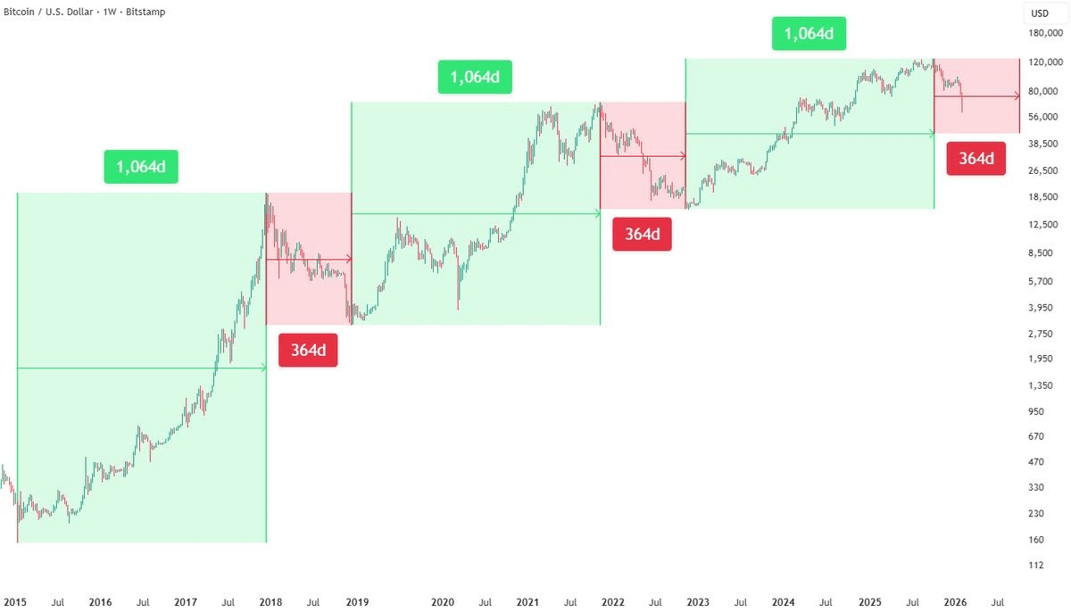 Khi nhìn từ góc độ dài hạn, hành động giá $BTC tiết lộ một cấu trúc vĩ mô tái diễn. Trong ba chu kỳ lớn gần đây nhất, BTC đã theo một nhịp điệu dựa trên thời gian tương đối nhất quán: