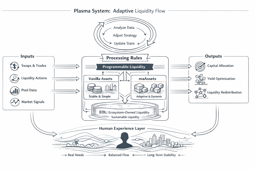 Và câu hỏi then chốt là đầu ra đi đâu. Nếu dữ liệu chỉ được đọc để báo cáo, nó vẫn là một bảng điều khiển lạnh lẽo. Nhưng nếu nó tạo ra hành động, nó trở thành một cơ chế. Ở đây, Plasma dường như muốn định hướng thanh khoản như một dòng chảy có kỷ luật, gửi vốn đến nơi cần nhất, sau đó để nó trở về khi áp lực giảm bớt, như lưu thông. Khi trạng thái thay đổi, dữ liệu mới được tạo ra. Hệ thống lại đọc, lại điều chỉnh. Một vòng phản hồi. Nghe có vẻ đơn giản, nhưng DeFi đã thiếu chính xác loại sự đơn giản có kỷ luật này.