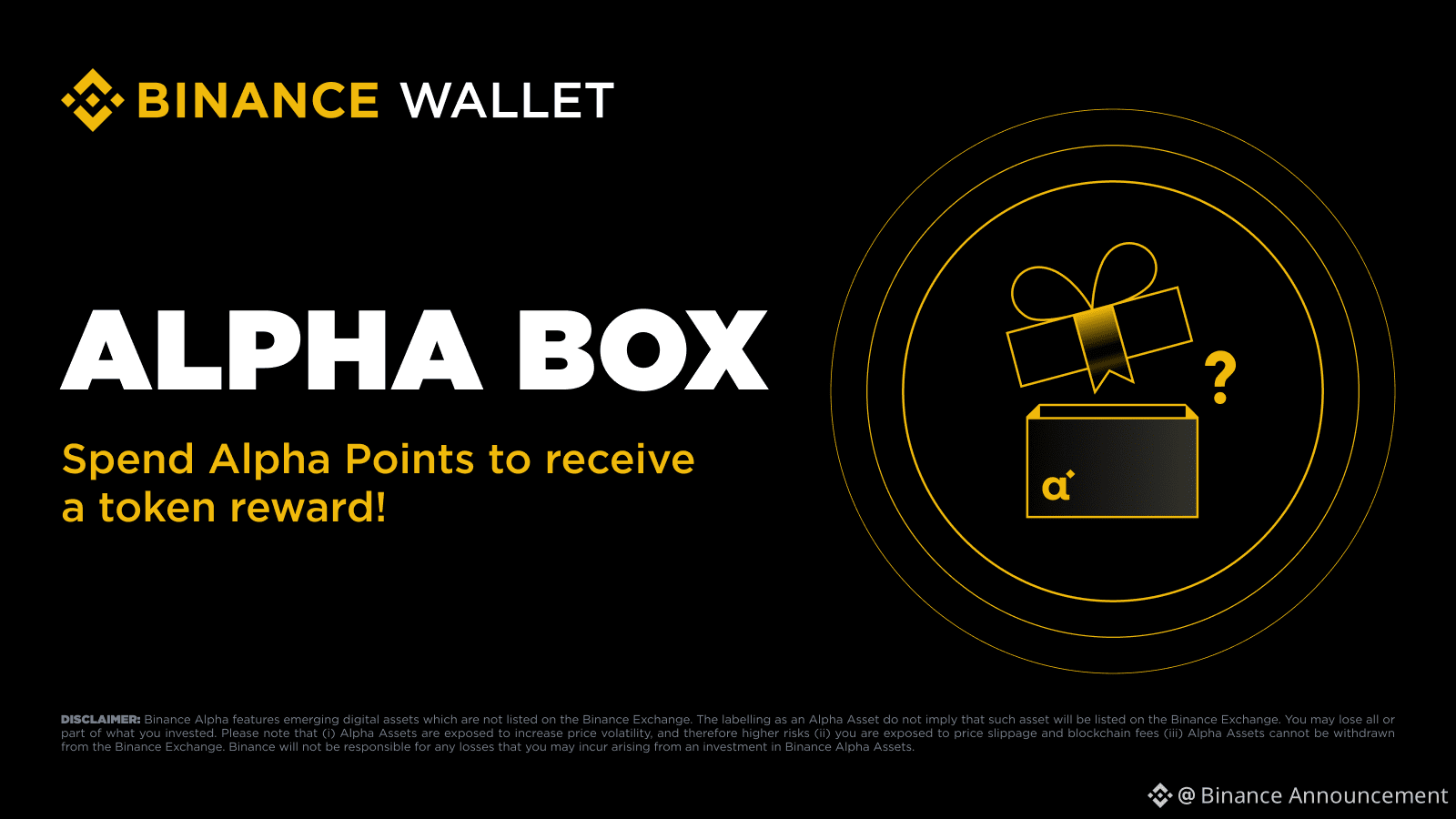 Alpha Box là mô hình airdrop mới do Binance tiên phong, trong đó nhiều dự án cùng gộp token của họ vào một sự kiện duy nhất. Người dùng có thể tham gia bằng cách đổi Binance Alpha Points của mình để nhận airdrop Alpha Box và nhận token có giá trị tương đương từ một trong các dự án nổi bật trong hộp. Ngoài ra, Alpha Box có thể bao gồm các dự án đã từng ra mắt trên Binance Alpha, mang đến cho người dùng cơ hội thứ hai để tham gia các dự án giai đoạn đầu này.
