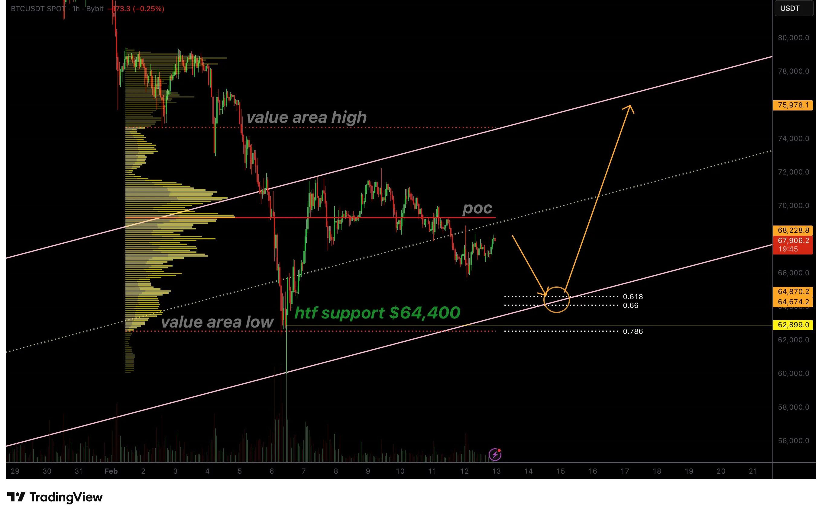🔸Tâm điểm lúc này dồn cả vào vùng giá $65,000. Tại sao con số này lại quan trọng? Đây là điểm hợp lưu cực đẹp giữa hai yếu tố kỹ thuật uy tín nhất là đáy của kênh giá tăng và mức Fibonacci 0.618.