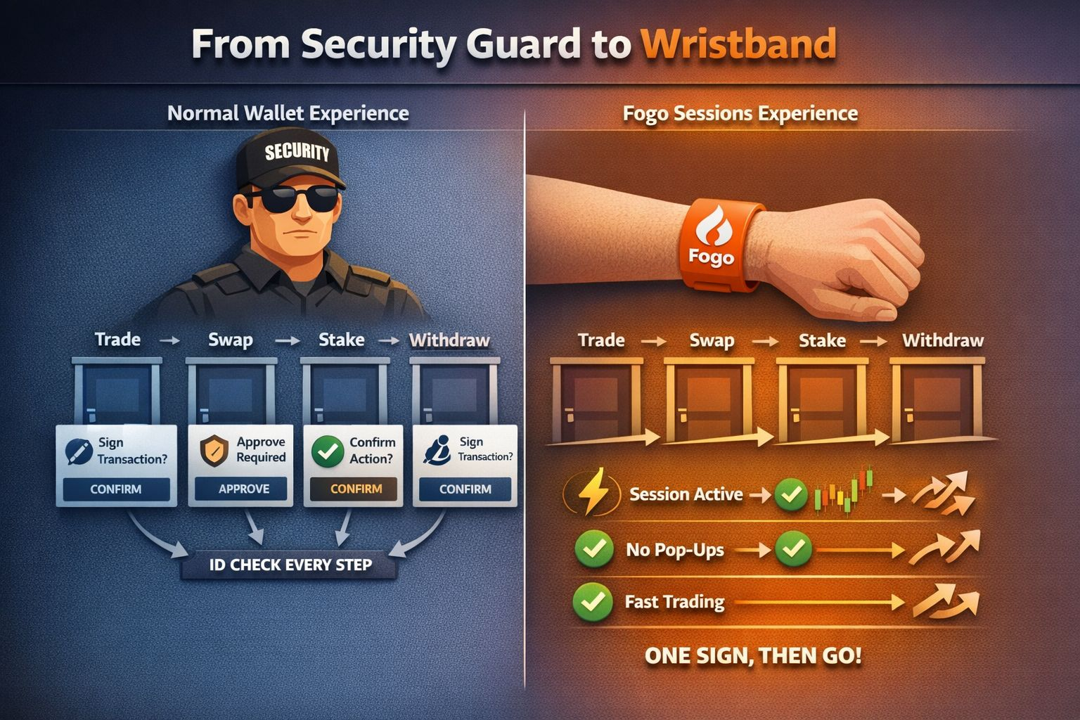 The most human way to picture it is this: normally your wallet acts like a security guard who asks for your ID every time you open a door. Fogo Sessions tries to make it more like a wristband at an event—still secure, still controlled, but you don’t have to stop and show your ID at every hallway. The chain treats “I’m here to do this set of actions for this period of time” as a first-class thing, not an afterthought.