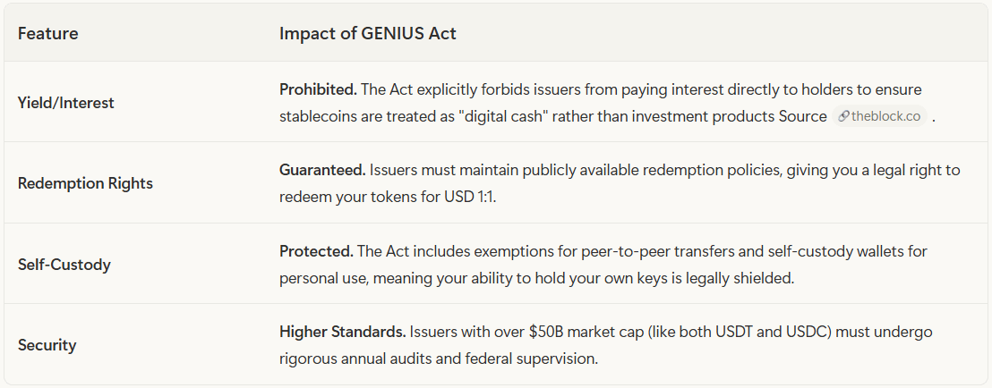 The Guiding and Establishing National Innovation for U.S. Stablecoins (GENIUS) Act , signed into law on July 18, 2025, has fundamentally reshaped the stablecoin landscape. For a holder of $USDT and $USDC USDC , the impact ranges from increased security and legitimacy to potential operational shifts for the issuers.